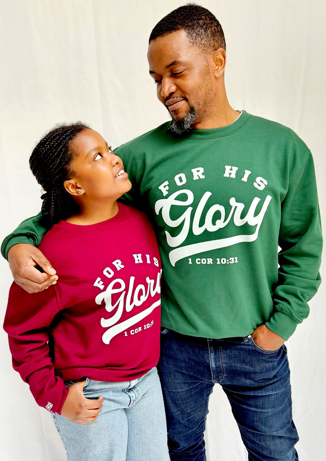 Featuring a 'For His Glory' text design on the front with 1 Corinthians 10:31 referenced, this crew-neck sweatshirt has a classic design and features a ribbed collar, cuffs and hem in a soft cotton-faced fabric.