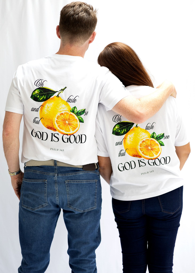 Featuring a back design with additional front detail, rock the fashionable ‘lemon’ trend with a God-focused message, perfect for the whole family.